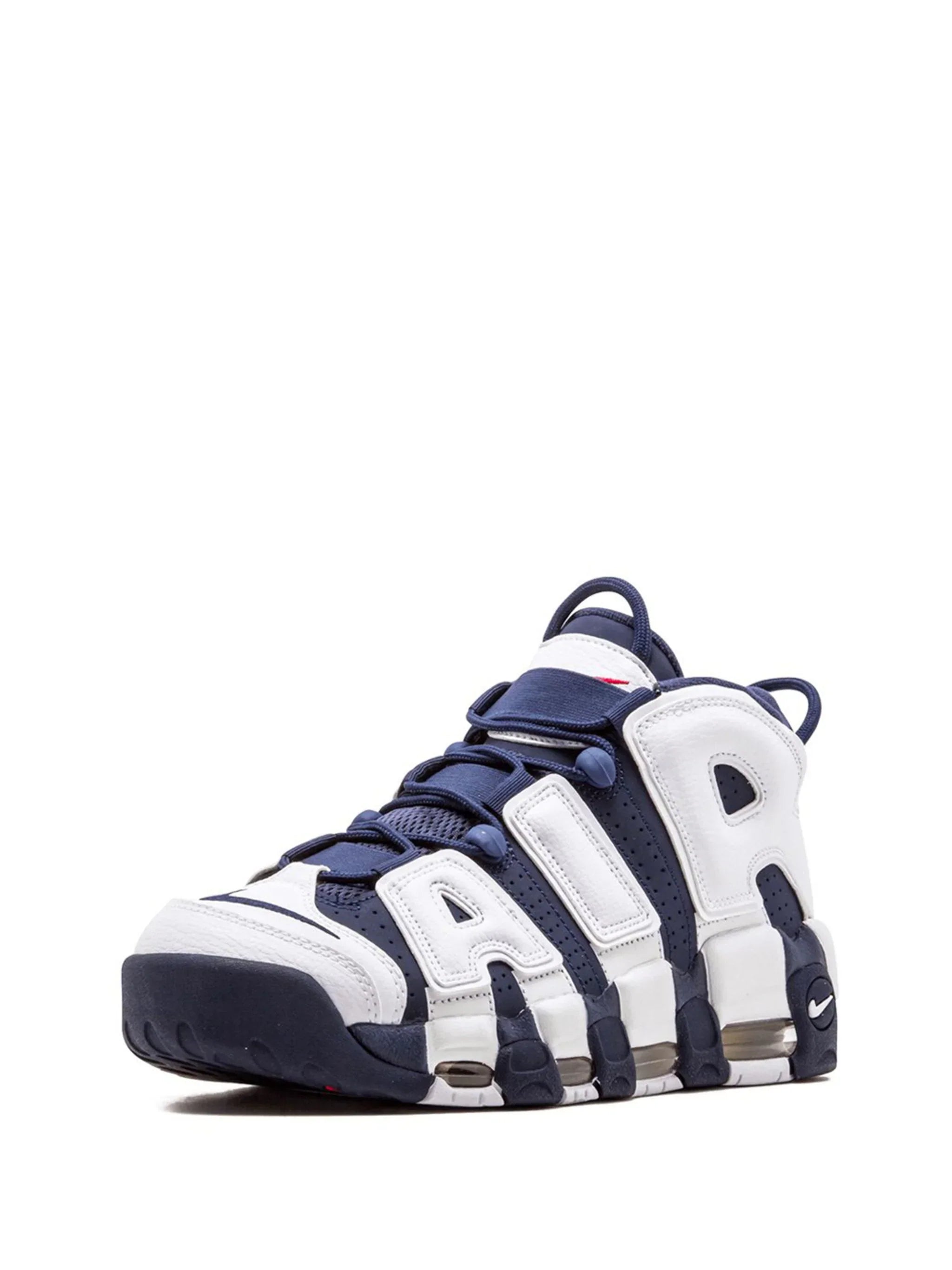 Nike's unmistakable Air More Uptempo sneakers arrive in a white and navy blue construction for a USA-themed 'Olympic 2020'' design. The word 'AIR' is boldly emphasised on the sides in padded letters for an instantly recognisable look, while a rubber sole with visible Air cushioning provides all-important comfort and bounce.